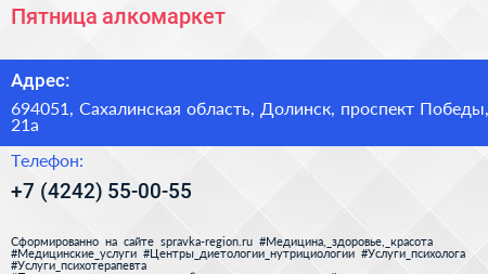 Пятница, алкомаркет по адресу 694051, Сахалинская область, Долинск, проспект Победы, 21а в дальнейшем Организация, размещена в следующих категориях: