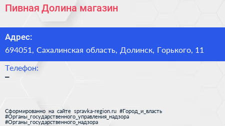 Пивная Долина, магазин по адресу 694051, Сахалинская область, Долинск, Горького, 11 в дальнейшем Организация, размещена в следующих категориях: