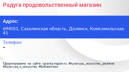 Радуга, продовольственный магазин по адресу 694051, Сахалинская область, Долинск, Комсомольская, 41 в дальнейшем Организация, размещена в следующих категориях: