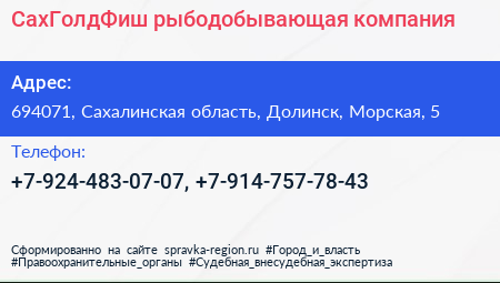 СахГолдФиш, рыбодобывающая компания по адресу 694071, Сахалинская область, Долинск, Морская, 5 в дальнейшем Организация, размещена в следующих категориях: