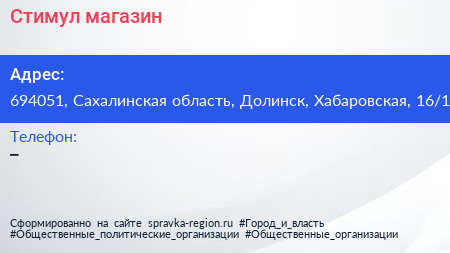 Стимул, магазин по адресу 694051, Сахалинская область, Долинск, Хабаровская, 16/1 в дальнейшем Организация, размещена в следующих категориях: