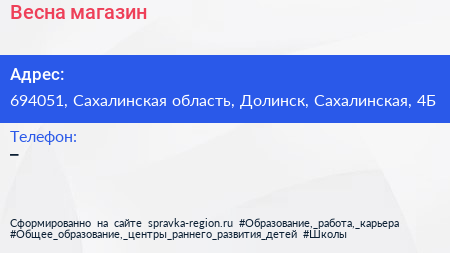Весна, магазин по адресу 694051, Сахалинская область, Долинск, Сахалинская, 4Б в дальнейшем Организация, размещена в следующих категориях: