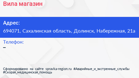 Вила, магазин по адресу 694071, Сахалинская область, Долинск, Набережная, 21а в дальнейшем Организация, размещена в следующих категориях: