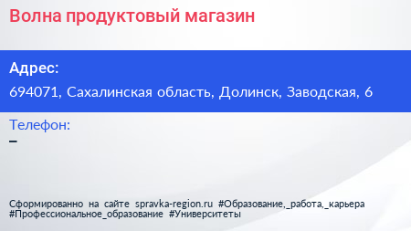 Волна, продуктовый магазин по адресу 694071, Сахалинская область, Долинск, Заводская, 6 в дальнейшем Организация, размещена в следующих категориях: