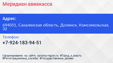 Меридиан, авиакасса по адресу 694051, Сахалинская область, Долинск, Комсомольская, 32 в дальнейшем Организация, размещена в следующих категориях: