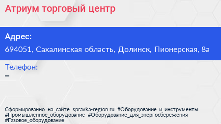 Атриум, торговый центр по адресу 694051, Сахалинская область, Долинск, Пионерская, 8а в дальнейшем Организация, размещена в следующих категориях: