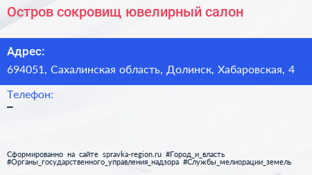 Остров сокровищ, ювелирный салон по адресу 694051, Сахалинская область, Долинск, Хабаровская, 4 в дальнейшем Организация, размещена в следующих категориях: