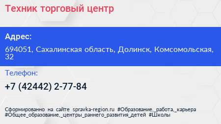 Техник, торговый центр по адресу 694051, Сахалинская область, Долинск, Комсомольская, 32 в дальнейшем Организация, размещена в следующих категориях: