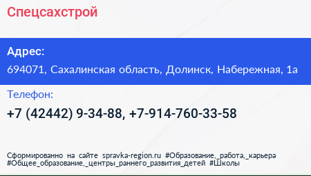 Спецсахстрой по адресу 694071, Сахалинская область, Долинск, Набережная, 1а в дальнейшем Организация, размещена в следующих категориях: