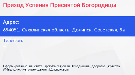 Приход Успения Пресвятой Богородицы по адресу 694051, Сахалинская область, Долинск, Советская, 9а в дальнейшем Организация, размещена в следующих категориях: