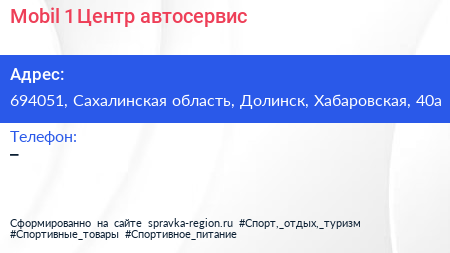 Mobil 1 Центр, автосервис по адресу 694051, Сахалинская область, Долинск, Хабаровская, 40а в дальнейшем Организация, размещена в следующих категориях: