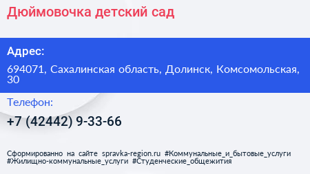 Дюймовочка, детский сад по адресу 694071, Сахалинская область, Долинск, Комсомольская, 30 в дальнейшем Организация, размещена в следующих категориях:
