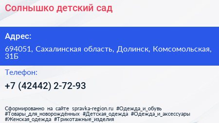 Солнышко, детский сад по адресу 694051, Сахалинская область, Долинск, Комсомольская, 31Б в дальнейшем Организация, размещена в следующих категориях: