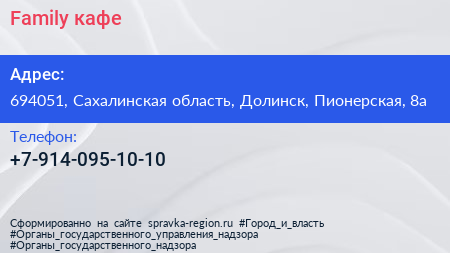 Family, кафе по адресу 694051, Сахалинская область, Долинск, Пионерская, 8а в дальнейшем Организация, размещена в следующих категориях: