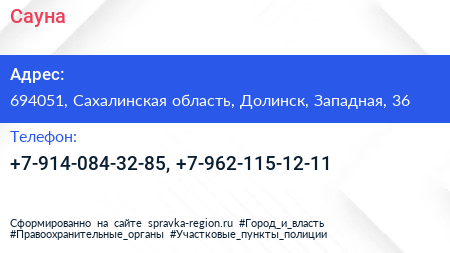 Сауна по адресу 694051, Сахалинская область, Долинск, Западная, 36 в дальнейшем Организация, размещена в следующих категориях:
