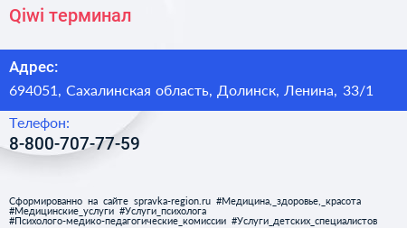 Qiwi, терминал по адресу 694051, Сахалинская область, Долинск, Ленина, 33/1 в дальнейшем Организация, размещена в следующих категориях:
