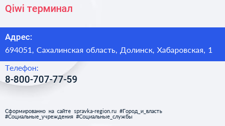 Qiwi, терминал по адресу 694051, Сахалинская область, Долинск, Хабаровская, 1 в дальнейшем Организация, размещена в следующих категориях:
