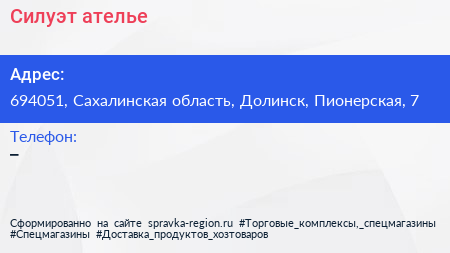 Силуэт, ателье по адресу 694051, Сахалинская область, Долинск, Пионерская, 7 в дальнейшем Организация, размещена в следующих категориях: