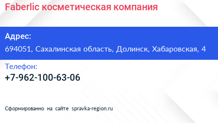 Faberlic, косметическая компания по адресу 694051, Сахалинская область, Долинск, Хабаровская, 4 в дальнейшем Организация, размещена в следующих категориях: