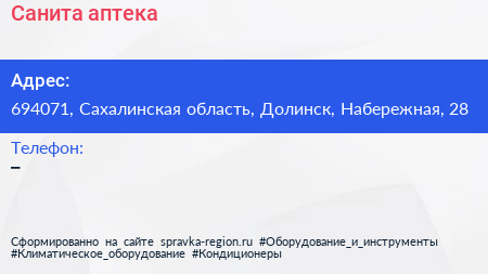 Санита, аптека по адресу 694071, Сахалинская область, Долинск, Набережная, 28 в дальнейшем Организация, размещена в следующих категориях: