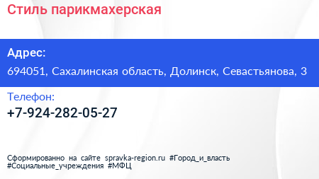 Стиль, парикмахерская по адресу 694051, Сахалинская область, Долинск, Севастьянова, 3 в дальнейшем Организация, размещена в следующих категориях: