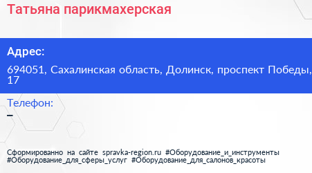Татьяна, парикмахерская по адресу 694051, Сахалинская область, Долинск, проспект Победы, 17 в дальнейшем Организация, размещена в следующих категориях:
