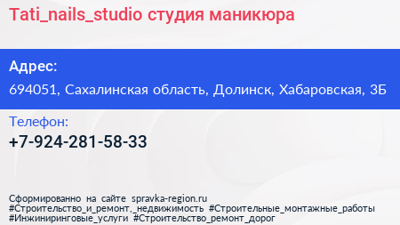 Tati_nails_studio, студия маникюра по адресу 694051, Сахалинская область, Долинск, Хабаровская, 3Б в дальнейшем Организация, размещена в следующих категориях: