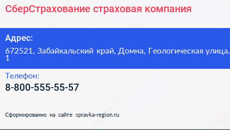 СберСтрахование, страховая компания по адресу 672521, Забайкальский край, Домна, Геологическая улица, 1 в дальнейшем Организация, размещена в следующих категориях: