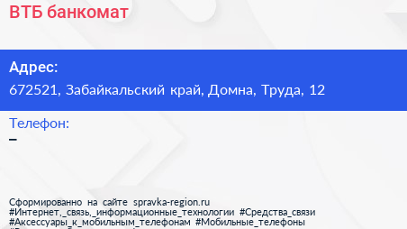 ВТБ, банкомат по адресу 672521, Забайкальский край, Домна, Труда, 12 в дальнейшем Организация, размещена в следующих категориях: