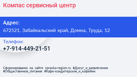 Компас, сервисный центр по адресу 672521, Забайкальский край, Домна, Труда, 12 в дальнейшем Организация, размещена в следующих категориях: