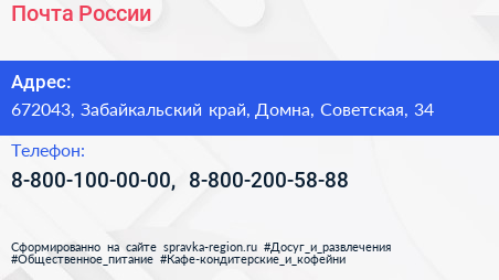 Почта России по адресу 672043, Забайкальский край, Домна, Советская, 34 в дальнейшем Организация, размещена в следующих категориях: