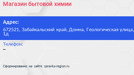 Магазин бытовой химии по адресу 672521, Забайкальский край, Домна, Геологическая улица, 1д в дальнейшем Организация, размещена в следующих категориях: