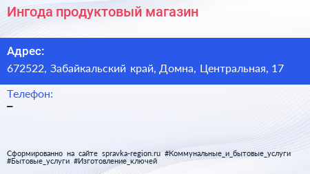 Ингода, продуктовый магазин по адресу 672522, Забайкальский край, Домна, Центральная, 17 в дальнейшем Организация, размещена в следующих категориях: