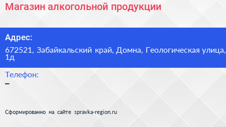 Магазин алкогольной продукции по адресу 672521, Забайкальский край, Домна, Геологическая улица, 1д в дальнейшем Организация, размещена в следующих категориях: