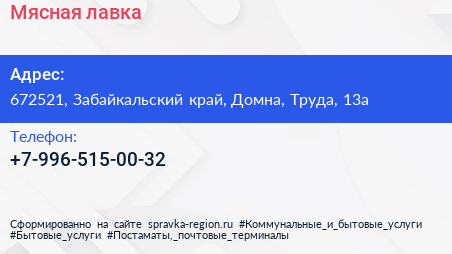 Мясная лавка по адресу 672521, Забайкальский край, Домна, Труда, 13а в дальнейшем Организация, размещена в следующих категориях: