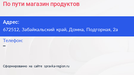 По пути, магазин продуктов по адресу 672512, Забайкальский край, Домна, Подгорная, 2а в дальнейшем Организация, размещена в следующих категориях: