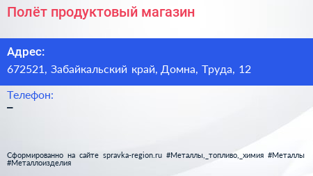 Полёт, продуктовый магазин по адресу 672521, Забайкальский край, Домна, Труда, 12 в дальнейшем Организация, размещена в следующих категориях: