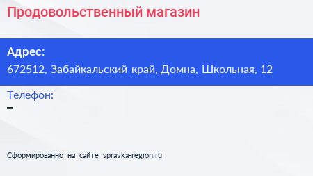 Продовольственный магазин по адресу 672512, Забайкальский край, Домна, Школьная, 12 в дальнейшем Организация, размещена в следующих категориях: