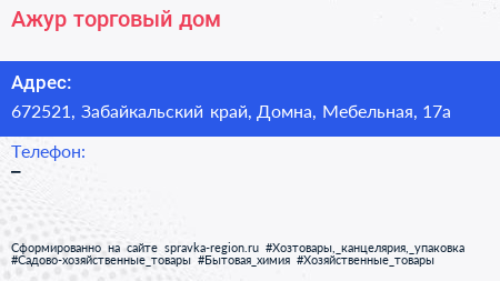 Ажур, торговый дом по адресу 672521, Забайкальский край, Домна, Мебельная, 17а в дальнейшем Организация, размещена в следующих категориях: