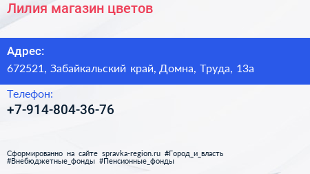 Лилия, магазин цветов по адресу 672521, Забайкальский край, Домна, Труда, 13а в дальнейшем Организация, размещена в следующих категориях:
