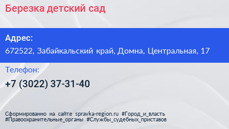 Березка, детский сад по адресу 672522, Забайкальский край, Домна, Центральная, 17 в дальнейшем Организация, размещена в следующих категориях: