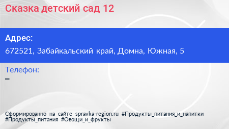 Сказка, детский сад №12 по адресу 672521, Забайкальский край, Домна, Южная, 5 в дальнейшем Организация, размещена в следующих категориях: