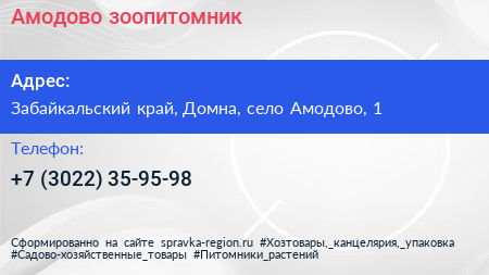 Амодово, зоопитомник по адресу Забайкальский край, Домна, село Амодово, 1 в дальнейшем Организация, размещена в следующих категориях: