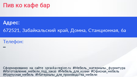 Пив & ко, кафе-бар по адресу 672521, Забайкальский край, Домна, Станционная, 6а в дальнейшем Организация, размещена в следующих категориях: