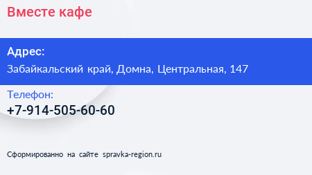 Вместе, кафе по адресу Забайкальский край, Домна, Центральная, 147 в дальнейшем Организация, размещена в следующих категориях: