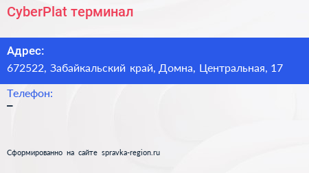 CyberPlat, терминал по адресу 672522, Забайкальский край, Домна, Центральная, 17 в дальнейшем Организация, размещена в следующих категориях:
