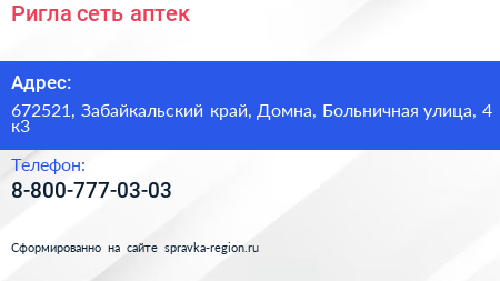 Ригла, сеть аптек по адресу 672521, Забайкальский край, Домна, Больничная улица, 4 к3 в дальнейшем Организация, размещена в следующих категориях: