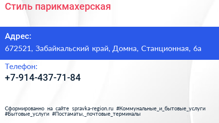 Стиль, парикмахерская по адресу 672521, Забайкальский край, Домна, Станционная, 6а в дальнейшем Организация, размещена в следующих категориях: