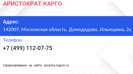 АРИСТОКРАТ КАРГО по адресу 142007, Московская область, Домодедово, Ильюшина, 2а в дальнейшем Организация, размещена в следующих категориях: