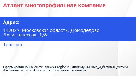 Атлант, многопрофильная компания по адресу 142029, Московская область, Домодедово, Логистическая, 1/6 в дальнейшем Организация, размещена в следующих категориях: